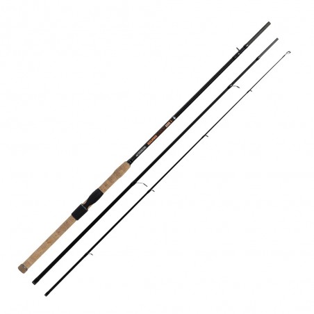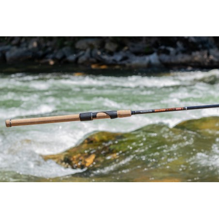 La canne possède une poignée en liège, un porte moulinet réglable et un accroche leurre rabattable.